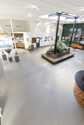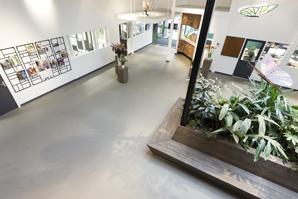 De designmogelijkheden van de EPI Superbase gietvloer zijn eindeloos. De vloer is verkrijgbaar in elke RAL kleur in een blend of een solid. Daarnaast kan er ook gekozen worden voor decoratieve flakes. Bij dit project is er gekozen voor de kleur Autumn. "Dankzij het vele daglicht in de hal komt de warme uitstraling van deze kleur heel goed tot haar recht.” aldus Laura. “De vloer is kleurvast en dankzij de extra onderlaag weet ik zeker dat Van den Bos Flowerbulbs nog jarenlang met deze vloer uit de voeten kan!”