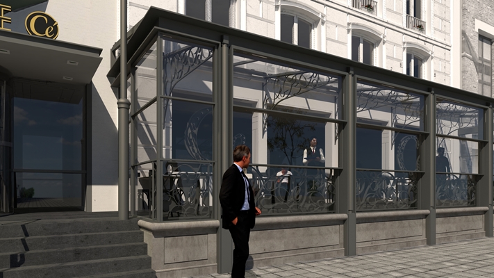 Het nieuwe ontwerp is een eigentijdse interpretatie van de smeedijzeren luifel met glazen lessenaarsdak uit 1900, passend bij de gepleisterde lijstgevel aan de markt. Voor de serre zijn speciale smeedijzeren spanten en hekwerken ontworpen, daarnaast krijgt de serre een bijzondere raamconstructie. Deze bestaat uit 3 meter brede verticale schuiframen die ervoor zorgen dat de gevel van de serre straks geheel te openen is. De plint zal bestaan uit geprofileerd Belgisch hardsteen.