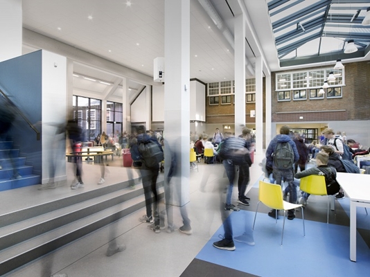 . De school wilde graag een overzichtelijk gebouw met aparte teamvleugels voor leerjaar 1, onderbouw, bovenbouw, havo en vwo, met elk een eigen thuisbasis. Om het hele gebouw goed te kunnen gebruiken, is de nieuwe aula een kloppend hart geworden, waarvan de teamvleugels en de overige ruimten zoals kunst, science en gymnastiek op een logische wijze zijn ontsloten.