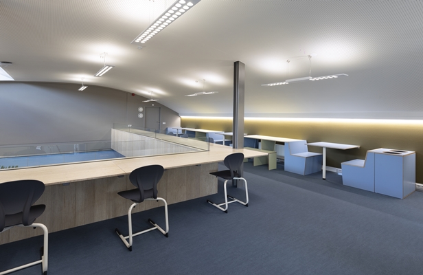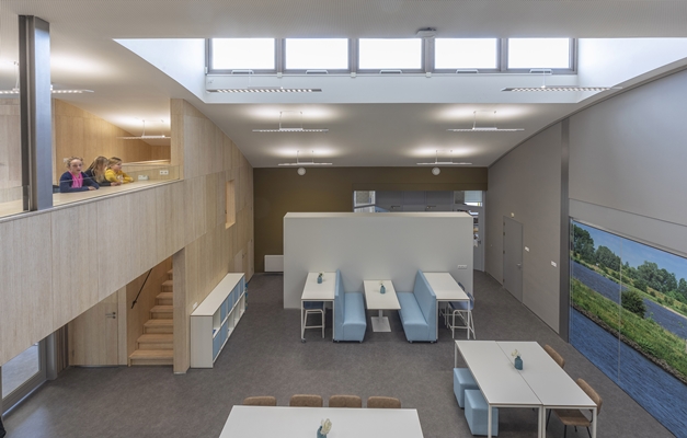 Deze is ingericht met werkplekken voor de opvang van kinderen na schooltijd. Bamboe is gebruikt voor wandbetimmeringen en de trap. Dit milieuvriendelijke en zeer slijtvaste materiaal zorgt ook voor een warme sfeer in het interieur. Het gebogen plafond is bezet met geperforeerde gipsplaten ten behoeve van de akoestiek.
