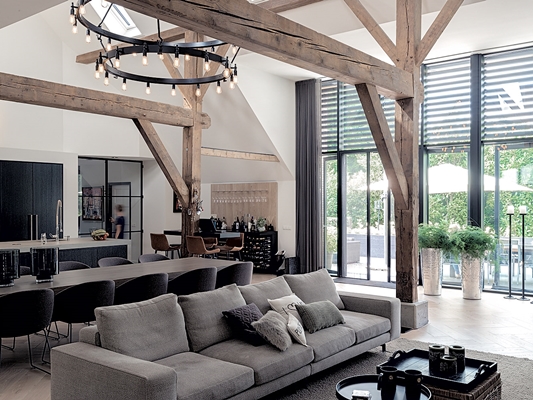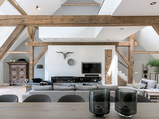 Wij hebben de deel, de ruimte waar vroeger de koeien stonden, getransformeerd naar een moderne leefruimte. In de oorspronkelijke staat was er sprake van een voorhuis waar het leven zich afspeelde.