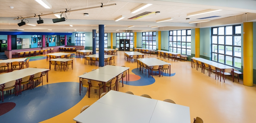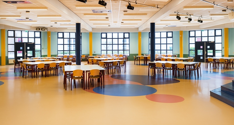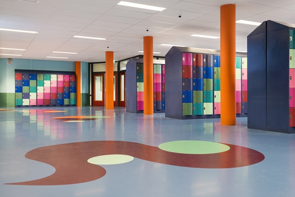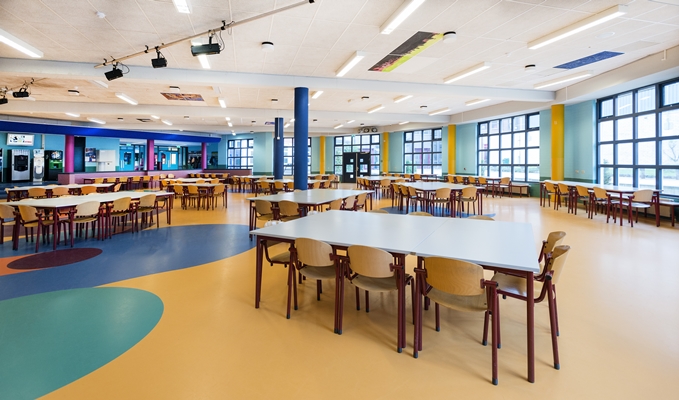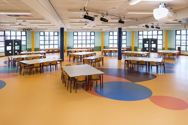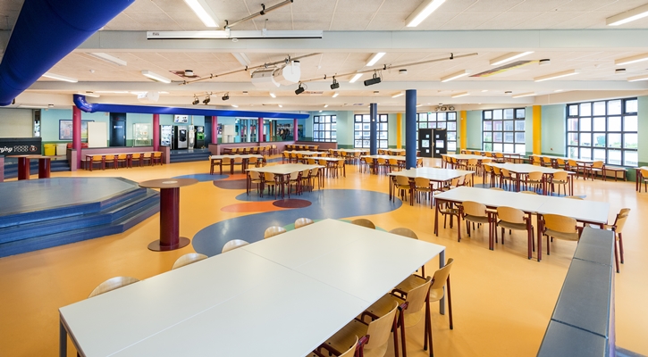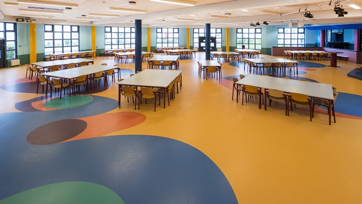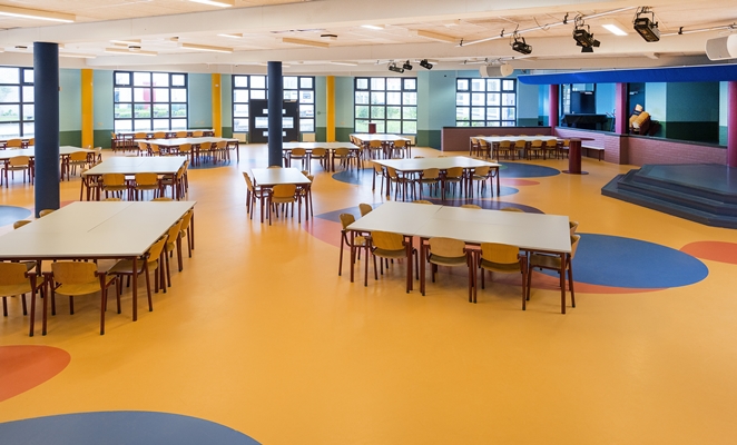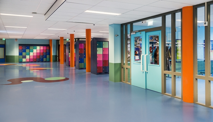 Een andere reden om voor een EPI Gietvloer te kiezen zijn de ongekende designmogelijkheden. Samen met een stylist heeft College de Heemlanden een uniek ontwerp gemaakt waar de huisstijlkleuren in terugkomen en waar zelfs ornamenten in verwerkt zijn. Hans Vervloet: “Bij ons eigentijdse, goed ingerichte schoolgebouw hoort natuurlijk ook een mooie vloer. De vloer moest kleurrijk zijn met een speels design en dat is uitstekend gelukt!”