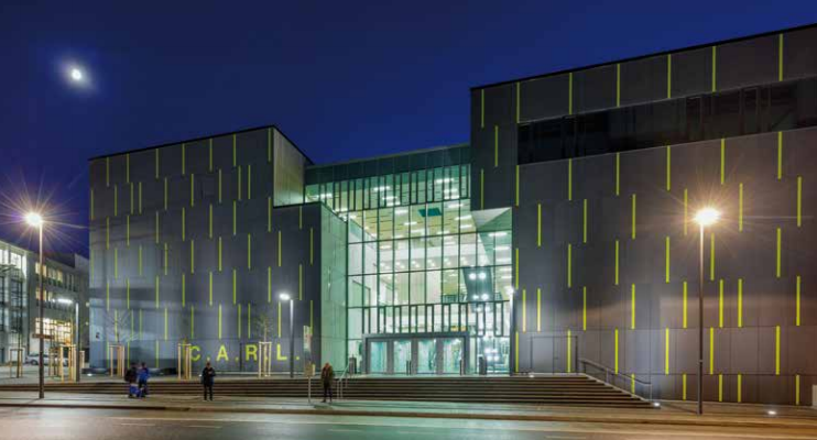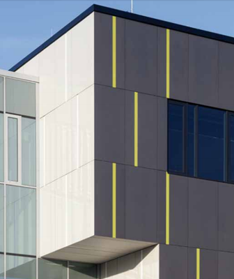 De voltooiing van het ontwikkelingsproject de universiteitscampus in Aken is één van de grootste in zijn soort in Europa. Bij de interface tussen Campus West en Campus Mitte werd een collegezaal gebouwd met een opvallend gestructureerde gevel van grijze vezelcementpanelen met gele aluminium inzetstukken.