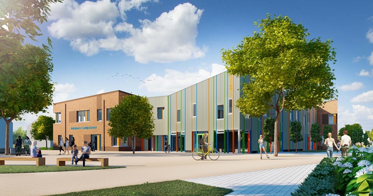 Op de locatie van de huidige Calvijnschool zal de nieuwbouw verrijzen. Alleen zal dan de oriëntatie van het gebouw nadrukkelijk gericht zijn op het vernieuwde dorpsplein. De hoofdentree zal gericht zijn op het vernieuwde plein zodat iedereen zich welkom voelt om het gebouw te gaan gebruiken.