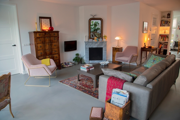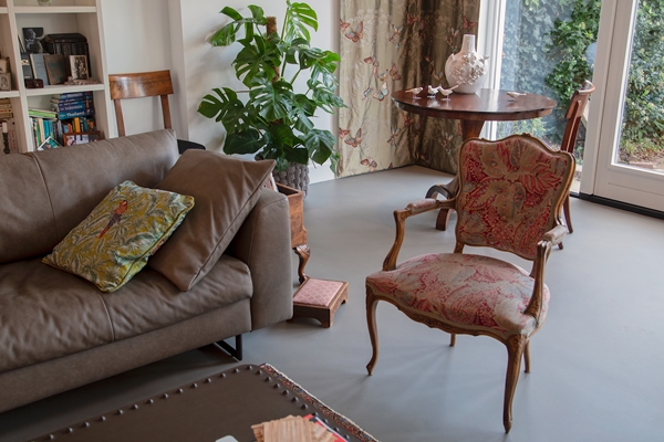De bewoner heeft jaren in een antiekzaak gewerkt. “Daar is mijn voorkeur voor oude spullen ontstaan,” vertelt hij. “Ons huis staat vol met antieke en kleurrijke spullen. Door te kiezen voor een betonlookvloer, ontstaat een heel mooi contrast tussen modern en klassiek en tussen ingetogen en kleurrijk.”