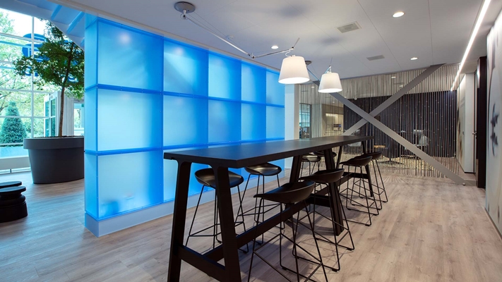 Hoge overlegtafel tussen akoestische wandpanelen.
