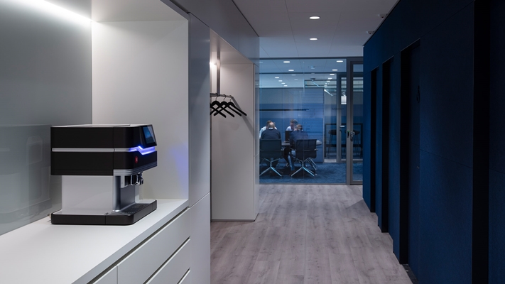Zicht vanuit pantry en garderobe richting een vergaderruimte in het kantoorgebied.