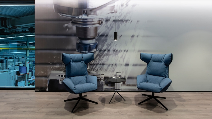 Verbinding en contrast in het interieur. IGS wilde een presentatie– en ontvangstruimte combineren met werk- en overlegplekken. Het totaal moest namelijk een ware IGS-experience worden. Hierin kunnen klanten verblijven tijdens hun bezoek aan de fabriek. De ontvangstruimte is daarom nu een grote open foyer, waarin gewerkt en overlegd wordt. De verschillende vergader- en overlegplekken zijn representatief en comfortabel. Daarnaast is de omgeving open en transparant van karakter. Een belangrijke ingreep vormt het openbreken van de wand tussen fabriek en kantoor. Hierdoor ontstaat er verbinding en contrast in het interieur.