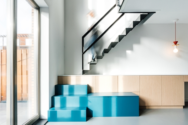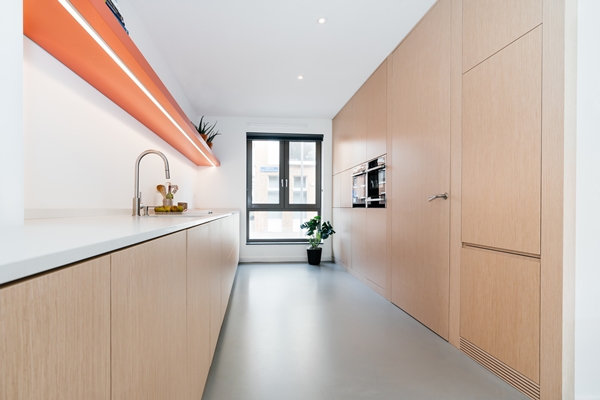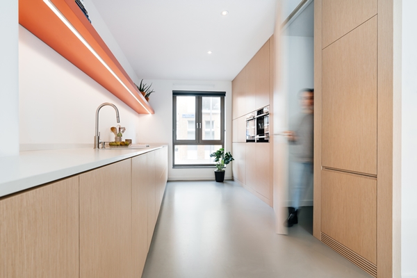 In Rotterdam is de wijk Nieuw-Crooswijk gerealiseerd. Voor onze opdrachtgevers hebben we het interieur van hun eengezinswoning ontworpen. Aan ons de opdracht om de begane grond als woon-leefkeuken te ontwerpen en de tv-ruimte als een aparte entiteit te benaderen. De tv- kamer is op de eerste verdieping gesitueerd en verbonden met de begane grond door een vide. De stalen, zwevende trap in de vide is een blikvanger geworden. Het keukenontwerp bevat de hele begane grond. Het keukenblok is over de gehele lengte van de woning doorgetrokken en onderdeel geworden van de trap. Naast dat dit een speels samenspel oplevert van materialen, biedt het veel opbergruimte. Naast deze vaste onderdelen hebben we ook het interieur ontworpen. Er zijn meubels van onder andere