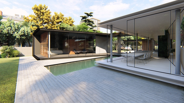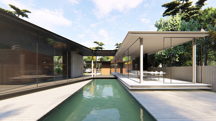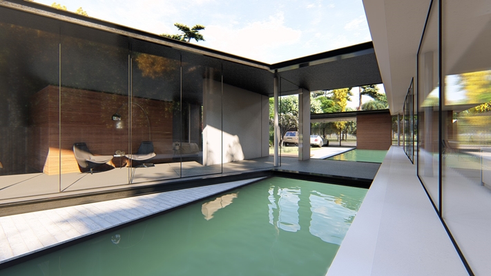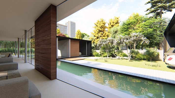 Door onderscheid te houden tussen de woonunit en de slaapunit heeft BRUIS een dynamische plattegrond ontwikkeld waarin alle functies zijn verwerkt. Middels een brug over het zwembad is de slaapunit te betreden.