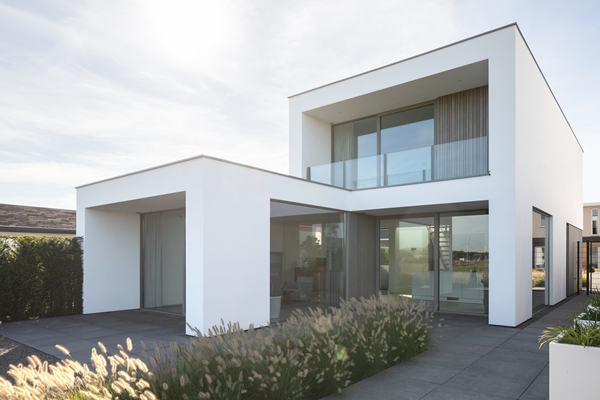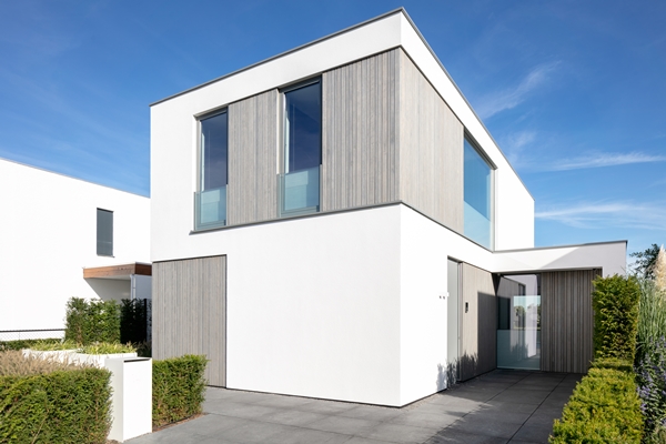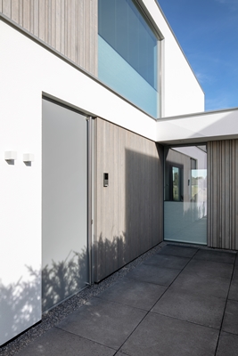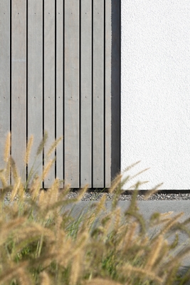 Op detail niveau is de woning strak en verfijnd. Het stucwerk loopt naadloos door, waarbij de consequente maatvoering rust en helderheid geeft aan het ontwerp. De kozijnen zijn minimaal in het zicht gedetailleerd en liggen in het vlak met de vergrijsde houten latten.
