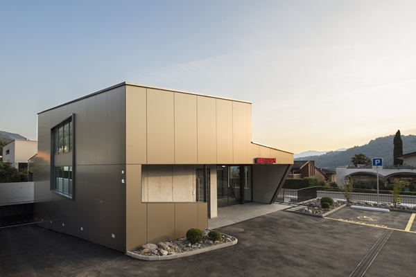 The new branch of Raiffeisenbank in Cassaratte in the Swiss Ticino is elegant and sleek. The precise design and the broken-up cubature represent the modern image of the bank, which in its realignment increasingly relies on the local requirements of its customers. Thus, the new building blends harmoniously into the alpine environment, in particular through the selected tonality. The elegant appearance is created in particular by the selected fixing system of the rear-ventilated façade. ALUCOBOND® Prefab invisible is an innovative glued fixing system for façade elements prefabricated in the workshop. The elements can be optimized and automated during the fabrication process. The panels are cut to size and Specially developed carrier sections are structurally bonded to the rear of the panels. Immediately after bonding the adhesion values allow the elements to be transported. This eliminates the complicated and time-consuming process involved in the use of sealing adhesives with sanding, cleaning and priming on the construction site.