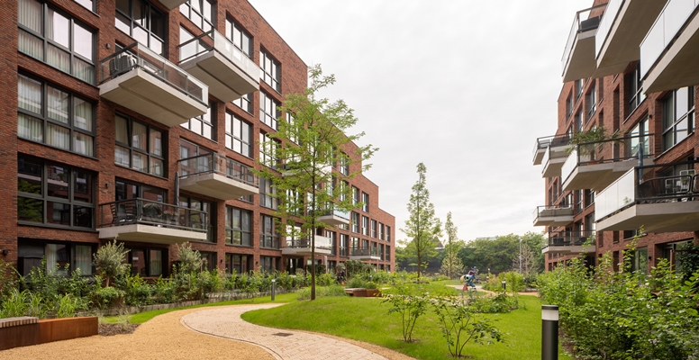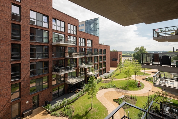 hebben de woningen ver uitstekende balkons en terrassen gericht op de gemeenschappelijke binnentuinen. Ze geven het stadsblok een parkachtig groen karakter die op de dakterrassen verder wordt voortgezet. De binnentuinen zijn een mooie inleiding op de verderop gelegen groene ecologische hoofdstructuur van de Gement.