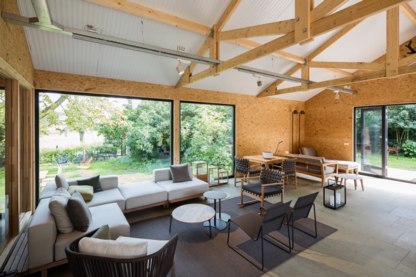 De gevelbekleding is ook van hout, natuurlijk. Ook hier is gekozen voor een intelligente bewerking die verdere afwerking niet nodig maakt. Een van oorsprong Japanse techniek, die het oppervlak van het hout laat verkolen, geeft het gebouw een bijzondere uitstraling. En ze is een positieve knipoog naar de reden waarom de opdrachtgever het gebouw nodig had: haar eerdere woon-werkhuis was tot twee keer toe in een jaar afgebrand.