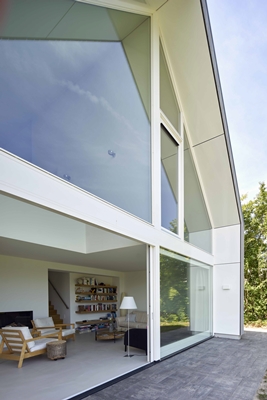 Een grote veranda geeft aan de verschillende zijden van de woning beschutte plekken om te verblijven. Met een buitenhaard kan het gezin een lange periode van het jaar ook in de avonden aangenaam buiten zitten. Samen met de vele openslaande deuren wordt het buitenleven in en rondom de woning versterkt.