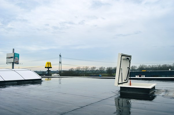 Bij deze bedrijfshal in Oosterhout heeft men gekozen voor een dakluik met ladder. Naast dat een dakluik met ladder lage aanschafkosten heeft zijn er nog meer voordelen: