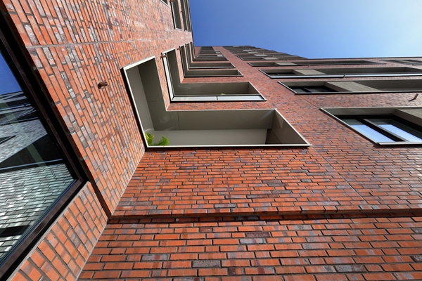 Ondanks zijn flinke volumes, bezit de bakstenen woontoren van Frank Pawlik Architekten een zekere lichtvoetigheid. „De combinatie van baksteen en metalen kaders ontneemt het ontwerp zijn zwaarte en geeft het gebouw een rustige horizontale gevelindeling mee“, aldus Quandt.