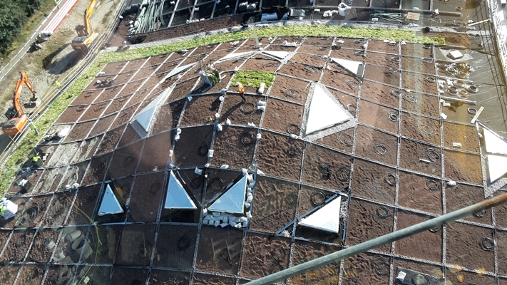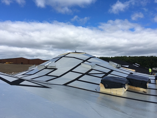 Als waterdichtlaag onder het begroeide dak zijn op de thermische isolatielaag RESITRIXĀ® SK W Full Bond EPDM dakbanen verkleefd. De zelfklevende hoogpolymeer bitumenlaag aan de onderkant zorgt ervoor dat de afdichting op zijn plaats blijft, zelfs bij de 20 tot 45 graden hellende koepels van het dak. De voegen tussen de afzonderlijke dakmodules werden afgedicht met de RESIFLEXĀ® SK-dilatatievoegband. Deze flexibele voegband laat bewegingen tot 40 mm in beide richtingen toe.