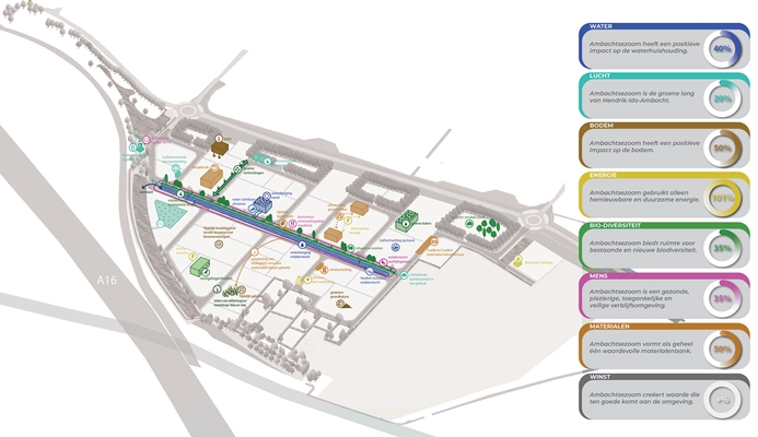 Bestrating, beplanting en inrichtingselementen worden zoveel mogelijk lokaal geproduceerd en hebben waar mogelijk een Cradle to Cradle certificering. In een materialenpaspoort voor zowel de openbare ruimte als de gebouwen worden alle materialen en producten opgeslagen voor hergebruik in de toekomst.