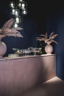 The shapes are sleek and harmonious, and bold in style. The pale pink pulls all the elements together while the warm dark blue serves as an understated background for the selected art on display, with a meeting of Old Masters and Modern Art.