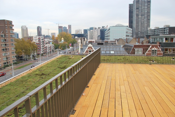 Het dakterras van het Van Vollenhovenkwartier in Rotterdam is voorzien van een groendak. Het voormalig kantoorpand is door RoosRos Architecten getransformeerd tot een modern woongebouw en beschikt over een daktuin waar de bewoners kunnen genieten van een uitzicht op de Rotterdamse skyline. Sempergreen heeft voor dit project 1200 m