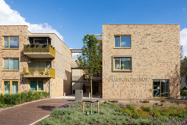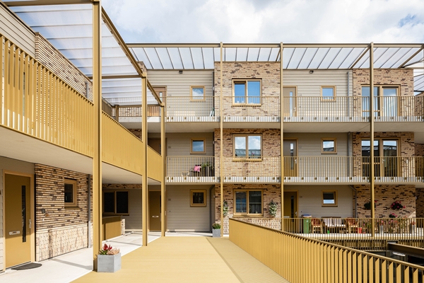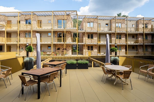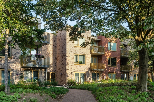 56 levensloopbestendige huurappartementen rond een ruim binnenhof in het centrum van Ede.