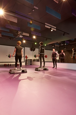 in diverse kleuren dragen bij aan de akoestiek, onder andere in de ruimte waar groepslessen gegeven worden, en waar dus zowel muziek als stemmen van de instructeur en sporters samenkomen en een akoestische uitdaging vormen.