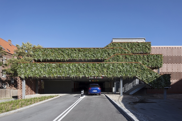 een innovatieve turn-key parkeergarage ontworpen die door toepassing van een speelse rode bakstenen gevel volledig geïntegreerd is in de historische omgeving. Dankzij de opvallende groene gevel aan de westgevel draagt de parkeergarage tegelijkertijd bij aan een schonere lucht, geluidsabsorptie en sociale veiligheid.