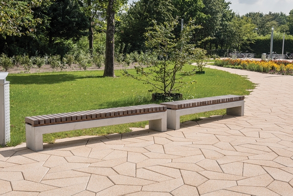 -hout dat niet snel splintert. De no-nonsense uitstraling van de betonnen bank past goed bij de moderne uitstraling van de campus en de bestrating van gele betonsteen. Dat geeft meer sfeer en licht en crëert een goed ruimte gevoel.