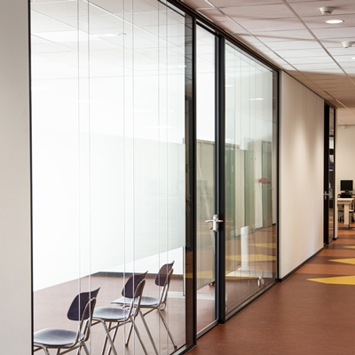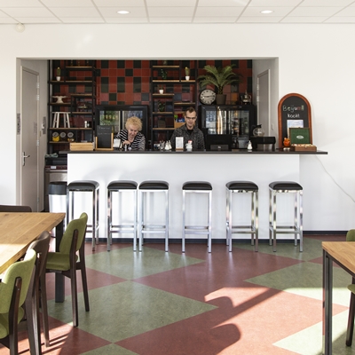 De vormen en kleursamenstellingen van de gevel komen ook binnen terug in onder andere de vloerafwerking van de begane grond. Om de 85 meter lange gang van de begane grond te breken is het vloerpatroon in stukken opgedeeld. Ook in de tegelwanden van de keuken, toiletten en de ontmoetingsruimtes is de gevel terug te vinden.