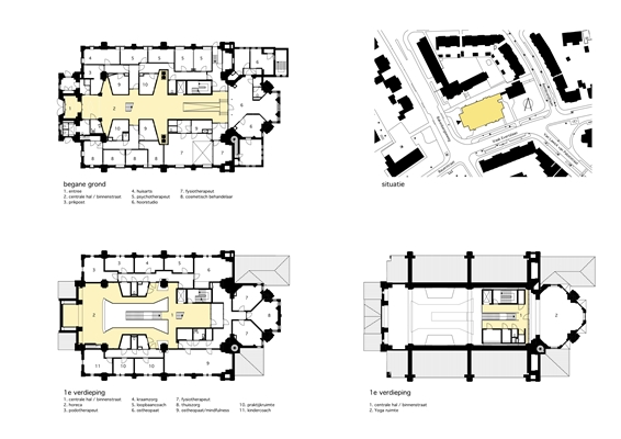 Strategie Architecten heeft ervoor gekozen om een binnenstraat te maken waaraan de verschillende zorgaanbieders te vinden zijn. De binnenstraat zorgt ervoor dat de lange zichtas van entree richting altaar gehandhaafd blijft. Hiermee blijft het middenschip van de kerk een open ruimte en blijven de gewelven zichtbaar vanuit de publiek toegankelijke ruimte. De zijbeuken zijn gevuld met de praktijkruimtes en ondersteunende functies. Er zijn twee verdiepingsvloeren in de kerk gemaakt. De 1e verdiepingsvloer sluit aan op het niveau van het orgelbalkon. Het balkon is een open ruimte gebleven met horecafunctie. De tweede verdiepingsvloer is kleiner en bevindt zich alleen ter plaatse van de kerktoren. Hier is een open ruimte gemaakt met fantastisch uitzicht over de stad door de spitsboogramen. De centraal gelegen trappen ontsluiten de verdiepingen en geven de mogelijkheid om de prachtige gewelven van dichtbij te bewonderen.