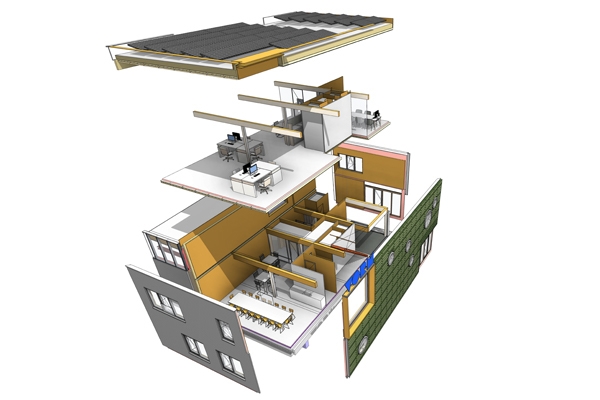 Het nieuwe kantoor is uitgevoerd in een flexibele houtconstructie, opgebouwd uit houten kolommen, massief houten CLT wanden en gelamineerde liggers met Lignatur vloer- en dakelementen. Een duurzaam en ecologisch constructiesysteem van hernieuwbaar bouwmateriaal. De houtconstructie is in het zicht gelaten en is daarmee in belangrijke mate bepalend voor de ruimtelijke expressie van het interieur. Perforaties in de houten plafonds zorgen voor een goede akoestiek zonder toegevoegde afwerkingen. De zwarte elektra buizen creëren een uniek, grafisch lijnenspel op wanden en plafonds.