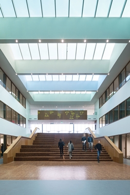 De klaslokalen zijn gegroepeerd rond een groot atrium: het levendige centrum van de school. In het atrium zijn zes VELUX