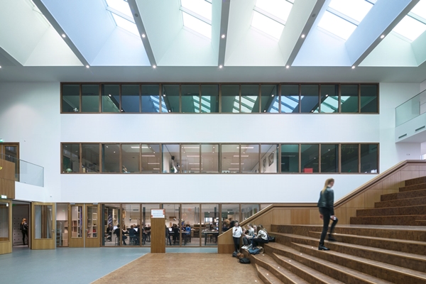 geplaatst om een grote hoeveelheid daglicht binnen te laten in de centrale hal en de klaslokalen eromheen.