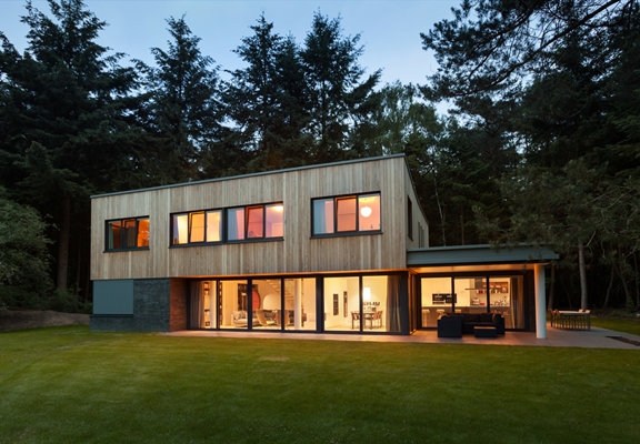 Woonhuis ontworpen voor een gezin met kinderen gelegen op een bijzondere boslocatie aan de rand van de stad.