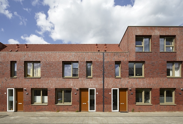 Aan de gevels kregen alle woningen en appartementen van LEVS architecten de donkerrode Hagemeistersortering Schleswig GT. Mout: "De bestaande bebouwing was uitgevoerd met bezande steen in rood en geel. De gevels van deze blokken zijn inmiddels behoorlijk vaal – de gevelsteen heeft de tand des tijds niet goed doorstaan. Wij kozen voor de hardere Hagemeistersteen, die lang mooi blijft. De Schleswig GT heeft dankzij kolenbrand en sintering bovendien een warmte en levendigheid waarmee we in de nieuwe architectuur een verdieping konden realiseren. De oppervlaktetextuur zorgt samen met de duurzame kwaliteit van de steen voor een verrijking van de lange wanden en de repeterende gevels. Sintering en kolenbrand geven de Hagemeistersortering een klassieke tint die zich heel goed leent voor het verlevendigen van de grote gevelvelden in deze projecten."