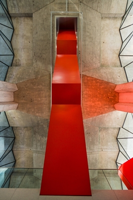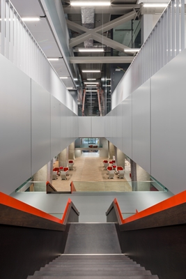 De meest opvallende ruimtelijke ingreep wordt gevormd door de centrale rode trap, die vanuit de laagbouw, door de betonnen tafelconstructie heen, tot bovenin de hoogbouw zigzagt. De trap volgt zoveel mogelijk bestaande vloeropeningen, waardoor de bouwtechnische impact beperkt blijft. Alle gedeelde voorzieningen, zoals de collegezalen en practicumruimtes, zijn rond de trap gepositioneerd. De schijnbaar simpele ingreep vormt hierdoor letterlijk de spil van het gebouw. De trap verbindt de campus met de twee faculteiten die aan weerszijden van het gebouw zijn gehuisvest.