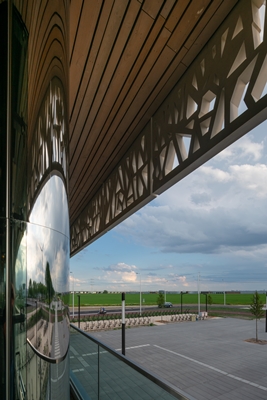 PUBLIC TRANSPORT HUB –Royale trappen, een hellingbaan en liften verbinden de verhoogde laan en het daaronder gelegen station op een soepele manier met de omgeving. De wachtruimtes zijn hoog, met veel daglicht. Het houten plafond met verspringende LED-verlichting geeft de wachtruimten een warme uitstraling. Vergeleken met andere regionale treinstations heeft station Lansingerland-Zoetermeer een uitzonderlijk hoog afwerkingsniveau. De heldere lijnen en doorzichten zorgen ervoor dat gebruikers snel en op een logische manier hun bestemmingen kunnen bereiken.