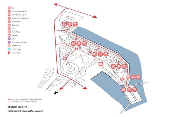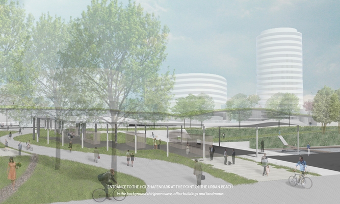 Een innovatief, adaptief mobiliteitsconcept, dat het wegverkeer in de nabije toekomst aanzienlijk reduceert, is noodzakelijk om dit parklandschap mogelijk te maken. Anderzijds is mobiliteit voor ieder individu, maar ook de hele maatschappij belangrijk; dit betekent, dat een overall strategie m.b.t. de mobiliteit voor de stad ontwikkeld moet worden, die zeer aantrekkelijk en veelzijdig is, gemakkelijk in het gebruik, met een klaarblijkelijke toegevoegde waarde. Aan zo een dergelijk overall mobiliteitsconcept kan het nieuwe mobiliteitsconcept voor de Holzhafenpark aanknopen. De hoge kwaliteit van het Holzhafenpark , dat gekenmerkt wordt door een fijnmazig voetgangers en fiets netwerk op verschillende niveaus, is aan alle zijden verbonden met het bestaande wegenetwerk. Aantrekkelijk vormgegeven auto- en fiets sharingpoints zijn gemakkelijk te vinden en centraal gelegen onder het golvende dak van het Park. De straat langs het oever van het havenbekken B, is als attractieve promenade de hoofdontsluiting voor auto’s, taxi’s en bezorgdiensten.