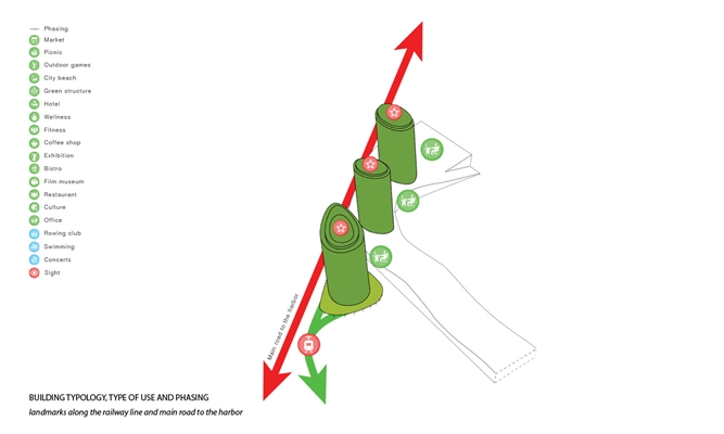 In de zomer genieten vroege vogels in de ochtend de stilte van deze plek; voor de lunch of in de avond ontmoeten bewoners en mensen die in de haven werken elkaar op de grote trap of duiken vanaf de zwemstijgers in het water. Tijdens de koelere seizoenen, nodigt de trap nog steeds uit om elkaar te ontmoeten en verbindt deze tegelijkertijd de verschillende voetganger routes in de haven. Het Strandpark verbindt de context, het stadstrand en Parkwelle.