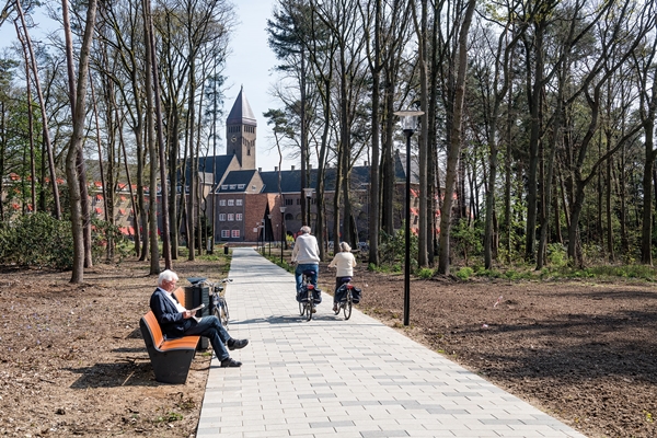 Vanuit de historie zijn op het terrein veel roodgebakken klinkers aanwezig. De nieuwe, drie meter brede verbindingspaden zijn van een afwijkend materiaal gerealiseerd. Om een duidelijk onderscheid te maken en omdat een aantal van die paden uitmondt in een groot plein. De keuze viel op betonnen verharding, de Breccia betontegel in de afmeting 40 x 20 cm van Struyk Verwo Infra. Een te kleine tegel zou wegvallen, een te grote tegel zou niet bij het pad passen. Deze tegel heeft een mooie variatie in de deklaag, waarmee wat meer nuance in de hele uitstraling ontstaat. De paden en pleinen zijn gelegd in halfsteensverband, met drie afwerkingen door elkaar, waardoor het geheel speels oogt.