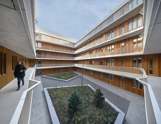 De intieme binnentuin met weelderig groen en warme oppervlakken creëert een oase in het stadscentrum voor de bewoners en fungeert tevens als sociale ontmoetingsplaats.