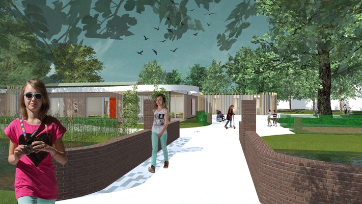 Dit hart wordt gemarkeerd door twee markante lichthappers die het eenlaagse gebouw een bijzondere identiteit geeft. De hoeken van het gebouw zijn voorzien van ronde loggia’s waardoor de onderwijsruimte zich eenvoudig naar buiten kan verplaatsen.