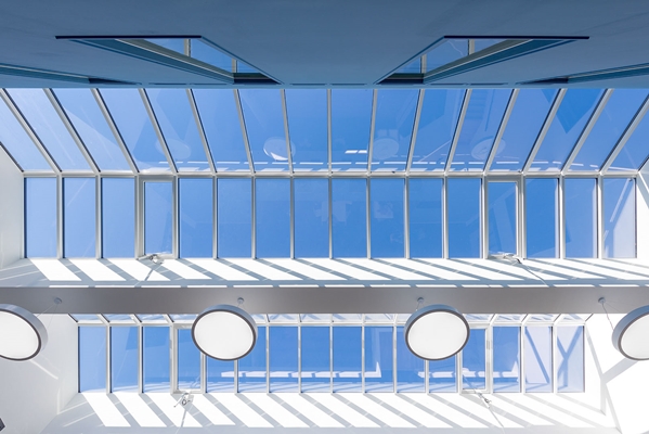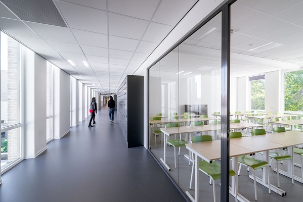 De zorgvuldige architectuur en de verfijnde detaillering van de gevel maken het grote gebouw afleesbaar in delen, terwijl door de transparantie de school zich etaleert naar haar omgeving.