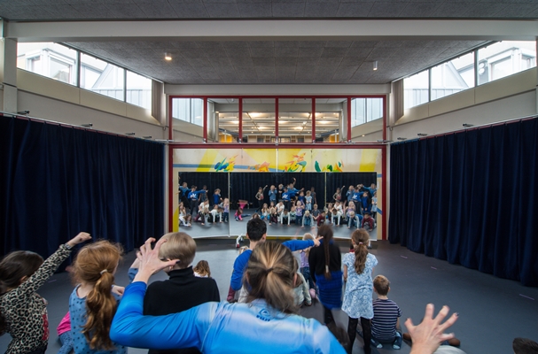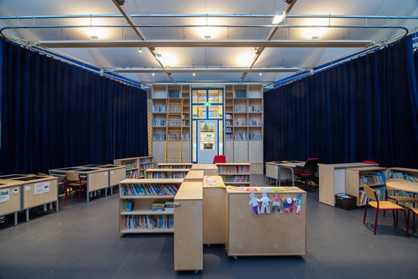 We hebben het hart van het gebouw aangepakt, de plek waar de hele school elkaar ontmoet. Hier zijn de mediatheek en het podium verbeterd en multifunctioneler gemaakt zodat er met meer kinderen, beter geleerd en opgetreden kan worden. We hebben de verlichting, de akoestiek en de luchtkwaliteit verbeterd. Zo zorgen we met duurzame materialen ook voor een gezondere school!