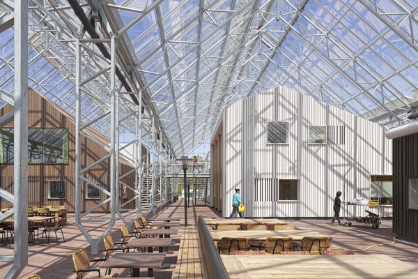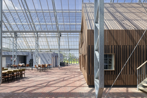 De verschillende gebouwen onder de glazen stolp refereren naar de hooischuren, kapschuren en T-boerderijen die in Gelderland te vinden zijn. Niet alleen om aan te sluiten op de boerenbedrijven in de omgeving. Maar ook om te voorkomen dat het complex aanvoelt als een bouwwerk van onmenselijk afmetingen. Door de diverse faciliteiten in losse onderdelen op te splitsen en de sfeer van het boerenleven in de gebouwen terug te laten komen, blijft het complete bedrijf natuurlijk en aangenaam aanvoelen.