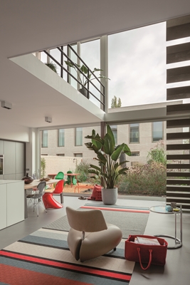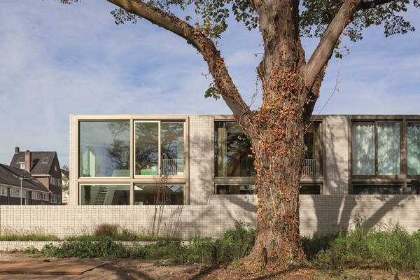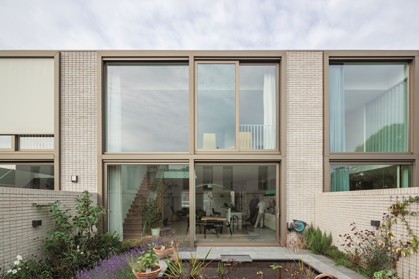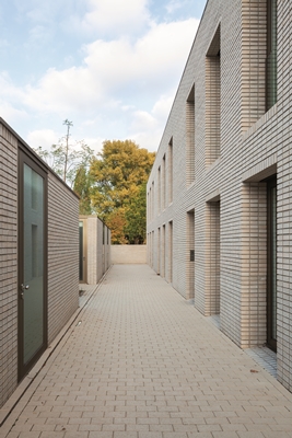 Een zeer degelijke en slijtvaste materialisatie wordt gecombineerd met een optimistische lichtheid die doet denken aan klassieke mid-century woonwijken van de 20de eeuw.