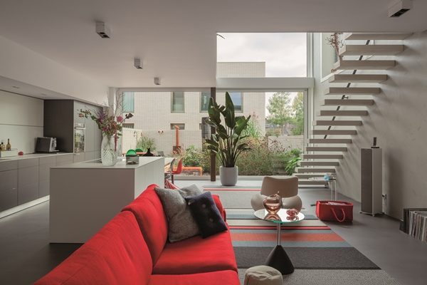 Er is gekozen voor zeer degelijke en slijtvaste materialen. De huizen hebben eerder gesloten gevels aan de noordkant en open zich met grote ramen naar het zuiden toe, om optimal van de warmte van de zon te kunnen profiteren. De vide vormt het ruimtelijke centrum van de woning en maakt het mogelijk dat de zon diep in het huis kan binnendringen. De glazen gevel aan de zuidkant realiseert een sterke visuele verbinding met de tuin. Door de toepassing van zeer grote schuiframen van 2,9m breed is de relatie tussen interieur en exterieur zo vloeiend als mogelijk. De ommuurde tuin is ca. 50m2 groot en heeft de sfeer van een patio. De huizen hebben een zeer hoge isolatiewaarde en zijn standard voorzien van zonwering, ook hebben de gebouwen gedeeltelijk groene daken.