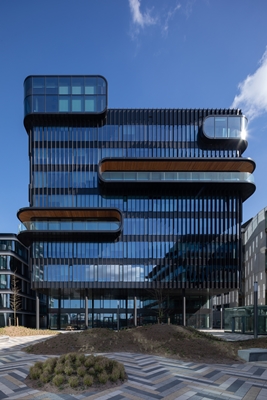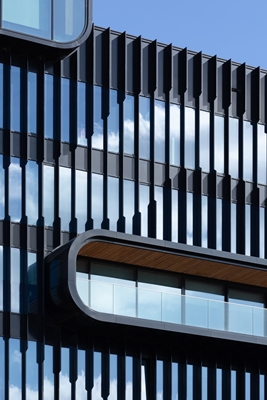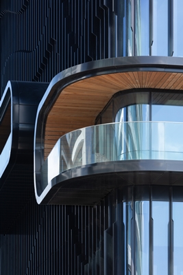 Voor het derde gebouw uit de serie op Danzigerkade 95 kozen we vanwege het evenwicht weer voor hoogbouw, zij het met een andere signatuur. Deze tien verdiepingen tellende constructie gaat uit van een futuristische visie, met enorme asymmetrische openingen en uit het pand stekende glazen dozen met uitzicht op het IJ en de stad. Door deze openingen op de rand van het gebouw te plaatsen zorgden we ervoor dat het grafische element van de gevel centraal kwam te staan, waarbij sculpturale lamellen de golfbewegingen belichamen.