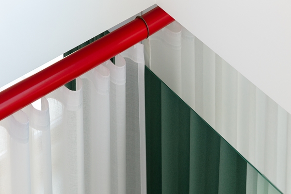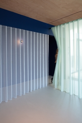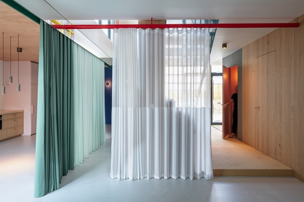 Er is veel aandacht gegaan naar de detaillering en stoffering van de gordijnen en gordijnkoven. De drie grodijnen op de begane grond zijn specifiek voor de plek ontworpen, bestaan uit verschillende materialen en hangen in een uniek ontworpen koof of rails. Hierbij maken we gebruik van de akoestische, lichtwerende en lichtdoorlatende en constructieve eigenschappen van textiel.